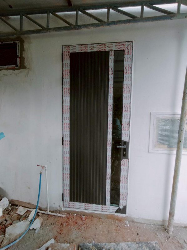 ประตูบานเปิดแบบทึบเสริมลอน พร้อมช่องแสงในตัว รวมมุ้งจีบ