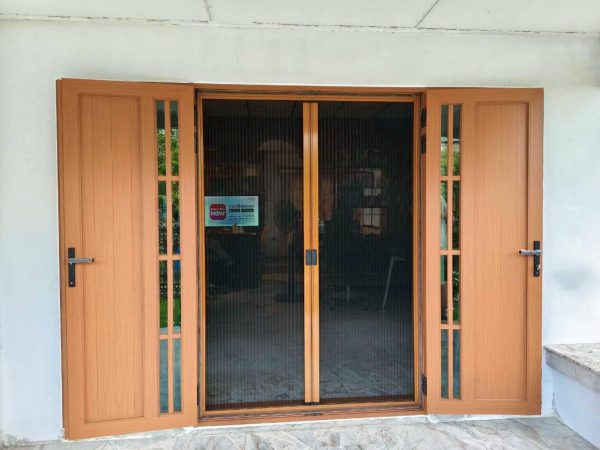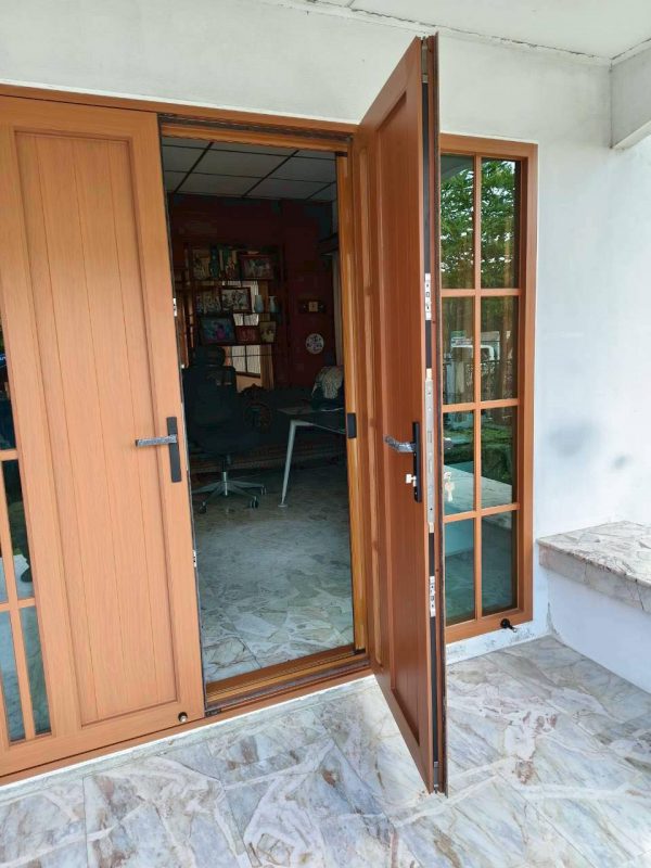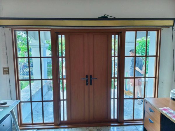 ชุดประตูบานเปิดคู่แบบทึบมีช่องแสงในตัวพร้อมแปะลูกฟัก