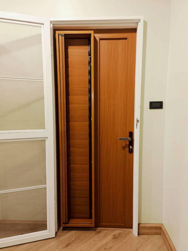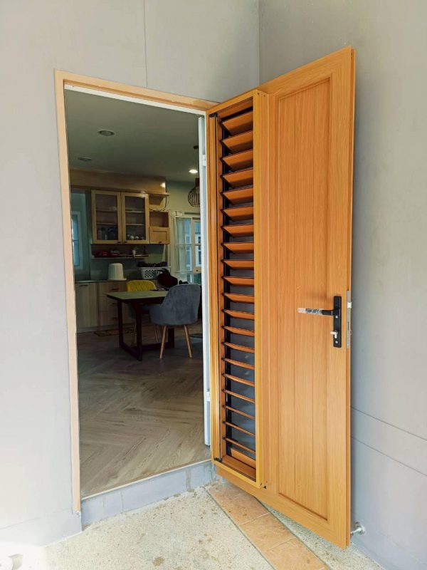 ประตูบานเปิดแบบทึบ พร้อมช่องเกล็ดเปิด–ปิดระบายอากาศ มุ้งจีบในตัว
