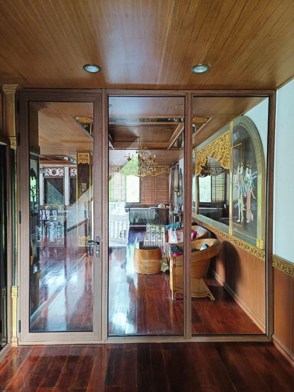 อะลูมิเนียมลายไม้สักทอง หนา 1.5 มม. กระจกใสหนา 6 มม.