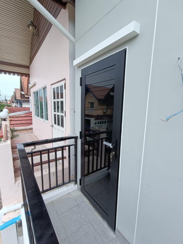 ประตูบานเปิดแบบทึบเสริมลอน พร้อมช่องแสงในตัว รวมมุ้งจีบ