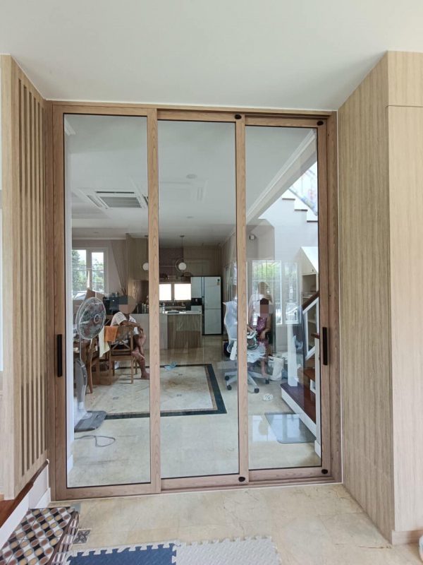 ชุดประตูบานเลื่อนแบ่งสามอิสระพร้อมช่องแสง และแปะลายลูกฟัก