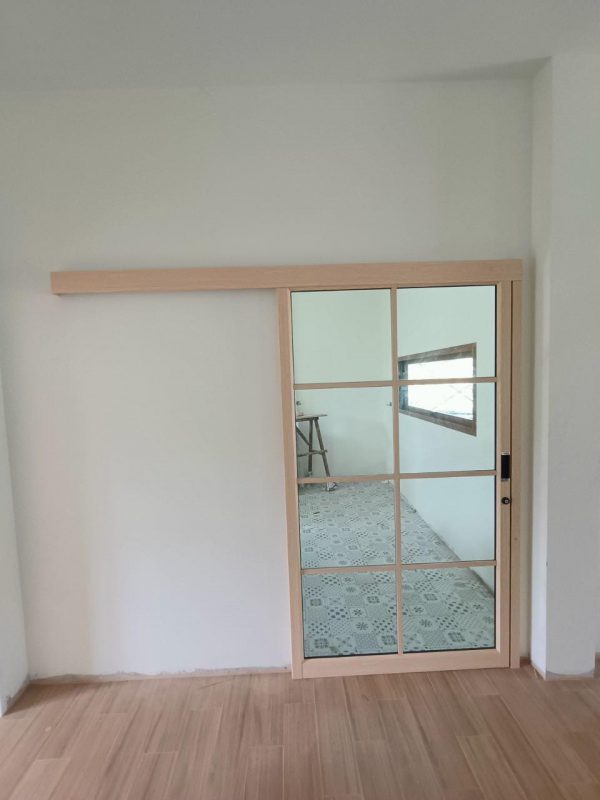 ประตูบานเลื่อนรางแขวนบน พร้อมช่องแสง และลูกฟูกล่าง