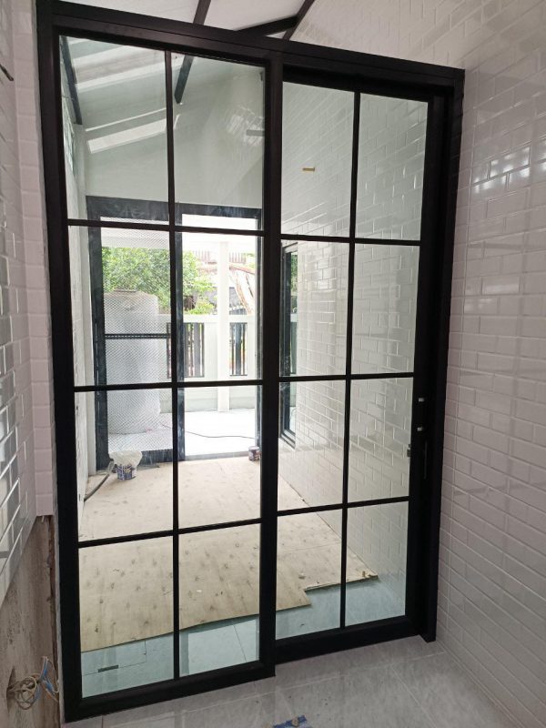 ประตูบานเลื่อนอลูมิเนียม รางบนสไตล์วินเทจล้อแบบลูกกลิ้งรางเหล็ก พร้อมแปะลายลูกฟัก
