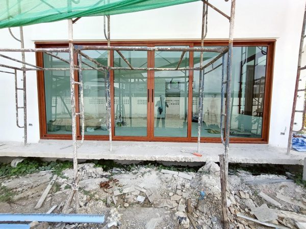 อลูมิเนียมสีลายไม้สักทอง ชุดยูโรโปรไฟล์ ยี่ห้อเมืองทอง