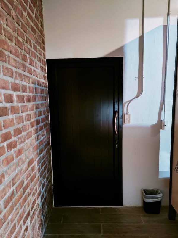 ประตูบานสวิงเดี่ยวเปิดเข้าออกสองทาง พร้อมแปะลายลูกฟัก